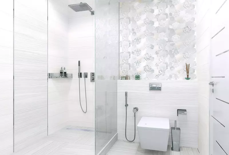 Насыщенный и богато украшенный центральный элемент уравновешивается сдержанной и деликатной базовой плиткой с каменной текстурой в белой и светло-серой гамме.