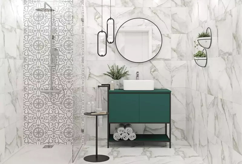 Материал имитирует белый мрамор с серыми прожилками. Декор выполнен на рельефе под формат 20х20 см, а его красивый узор — это искусная имитация инкрустации дерева в мрамор. Отделочный материал с сатиновой поверхностью может стать украшением кухни, санузла или прихожей, а также гостиной и балкона. Он подходит для отделки пола и для монтажа на стене.