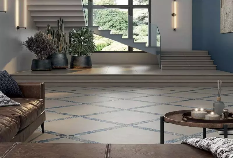 Базовая плитка с гладкой и структурированной матовой поверхностью «под цемент» представлена в формате 30х60 см, в трех оттенках: сером, светло-сером и синем.