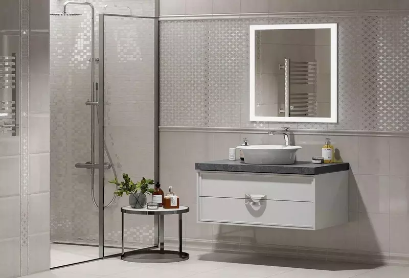 К базовой плитке прилагаются декоры «под мозаику» и с переливающимся геометрическим узором, полученным в результате использования в рисунке перламутрового состава. Для отделки пола предложен керамический гранит форматом 40,2х40,2 см – однотонный и с узором.