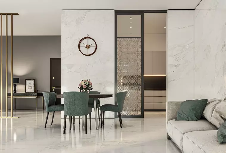 Крупноформатный керамогранит: 80х160 см и 160х320 см, поверхность - полированная.