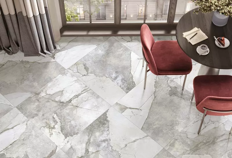Этот керамогранит сочетается с белыми и серыми мраморами, а также с деревянными текстурами и металлическими аксессуарами.