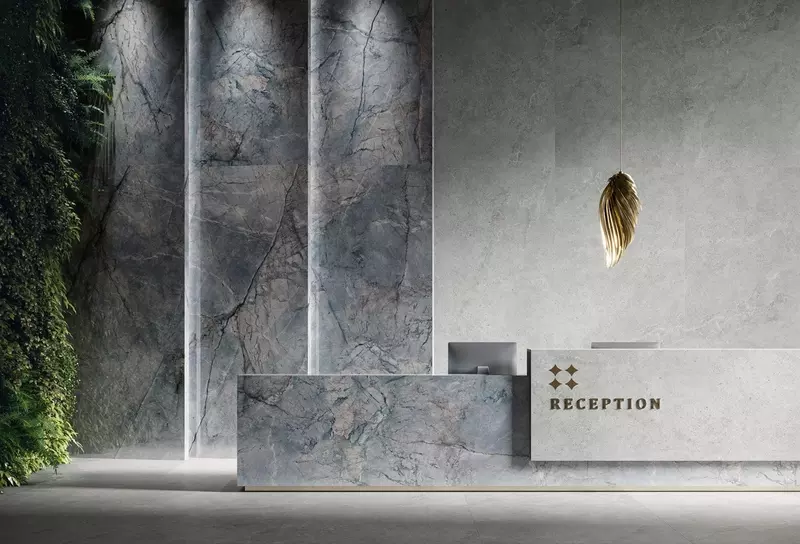 Крупноформатная плитка Monumental синего цвета предназначена для отделки ванных комнат, кухонь и гостиных, террасах, холлах, фасадах, а также в инвестиционных объектах (например, в приемной гостиницы). Слэбы форматов 60x120 см, 120x120 см и 120x280 см.