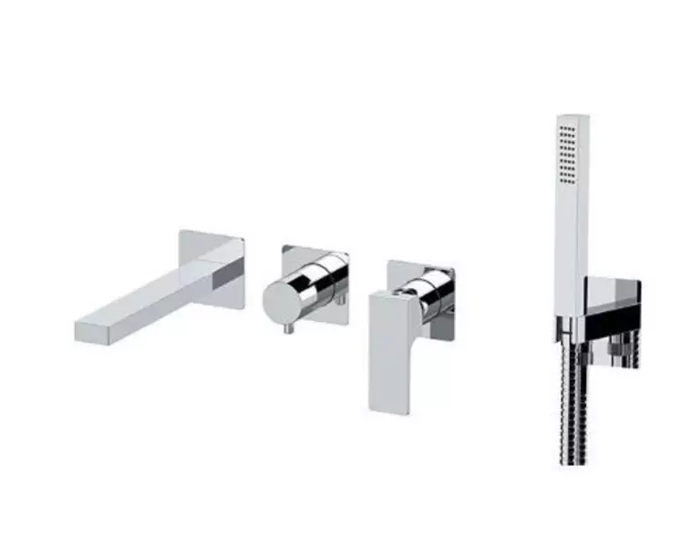 Двухвентильный скрытый комплект для ванны на отдельных ультраплоских пластинах (3 отдельные пластины и одно углубление), включает: однорычажный смеситель, дивертор с 2 выходами и настенный излив на одной ультраплоской прямоугольной пластине; душевой комплект на ультраплоской круглой пластине с подводкой воды, держателем, латунным ручным душем и гибким шлангом 150 см.