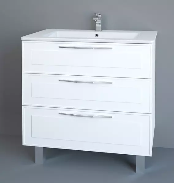 Тумба с раковиной «Spectrum» Мадейро 80 (Euphoria 80) белая бытовая выполнена в классическом стиле. Производство России. Поставляется в собранном виде. Монтаж тумбы напольный, угловая конструкция невозможна. Корпус изготовлен из ЛДСП с покрытием плёнкой, фасады из белого МДФ с плёнкой. Габариты тумбы в см: 79*46,5*82. Тумба без столешницы, с тремя ящиками и доводчиком, предназначена для раковин. Фаянсовая белая современная раковина прямоугольной формы без пьедестала имеет в центре одно готовое отверстие под смеситель. Размеры раковины в см: 77,6*47*19. Раковина одинарная полувстраиваемая, установка над стиральной машиной не предусмотрена. Гарантия на фаянс 5 лет. Вы можете купить тумбу с раковиной «Spectrum» Мадейро 80 (Euphoria 80) белую в нашем двухэтажном магазине сантехники площадью 4000 м2, где есть большой выбор мебели для ванной.