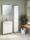 Цвет фасада - белый, зеркало, корпус - белый. Фурнитура выполнена в хромированном цвете, что придает шкафу стильный и современный вид.