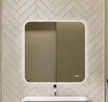 Контурное свечение выделяет его на фоне окружающих предметов и подчеркивает фактуру отделки (необычная штукатурка, рельефная плитка). Рассеиватель в край зеркала с диодной подсветкой создает эффект парящего в воздухе зеркала. Зеркало оснащено датчиком включения на взмах, встроенными часами и логотипом бренда Raval с подсветкой.
